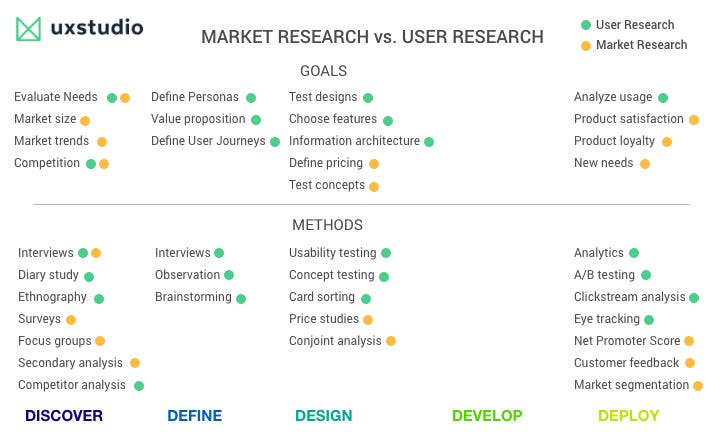 The graphic from UX Studio will help to understand how to combine market research and user research experience that address different questions and use at different stages of the product development process.
